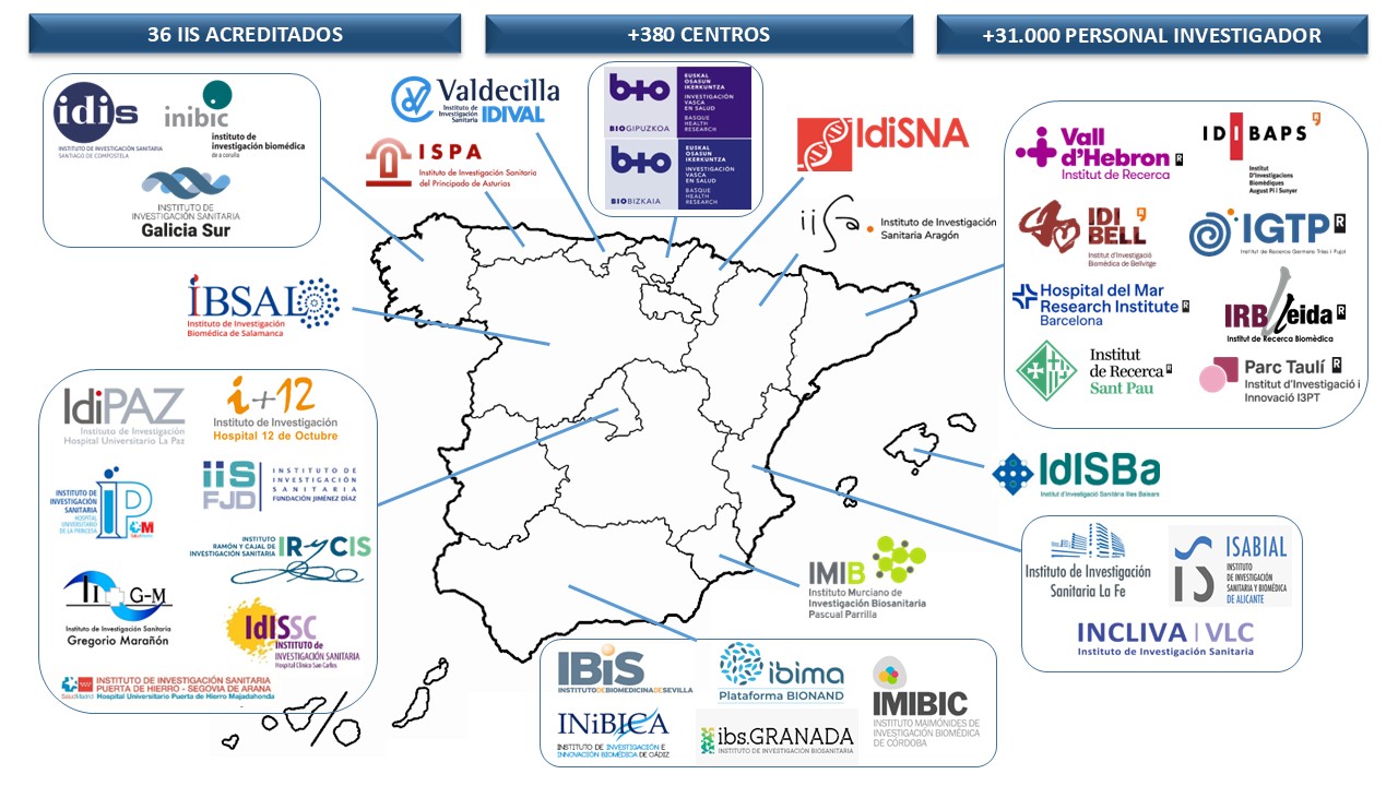 Actualmente, hay 36 Institutos de Investigación Biomédica o Sanitaria (IIS) acreditados repartidos en 13 Comunidades Autónomas, con más de 31.000 personas investigadoras adscritas en 380 centros sanitarios públicos, universidades y centros de investigación públicos y privados, entre otros. Los IIS son entidades dedicadas a la investigación básica y aplicada organizados en áreas/programas científicos. Son estructuras únicas dentro del Sistema Nacional de Salud (SNS), diseñadas para establecer institutos de investigación multidisciplinares. Estos institutos pretenden integrar diversos campos de estudio para potenciar las capacidades de investigación y mejorar los resultados de la atención sanitaria.